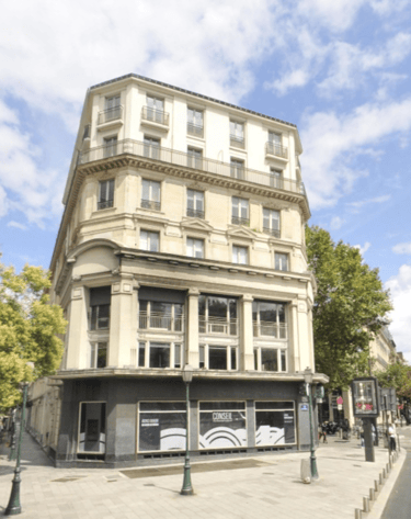 A l'angle du boulevard Sébastopol et de la rue de Turbigo à Paris, un immeuble ayant connu deux phases de surélévation à des époques différentes.